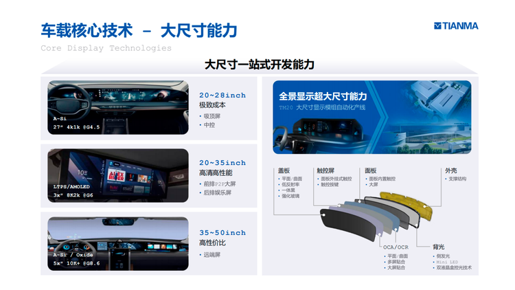 由于智能汽车普遍需要大面积显示空间,大面积显示技术开发能力与制造能力更能凸显「屏厂」的核心竞争力。天马拥有 20-50 英寸的车载显示面板开发能力,结合成本、性价比、性能等优势,同时拥有TM20大尺寸显示模组全自动产线。