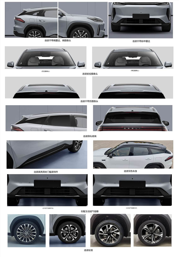 侧面采用传统机械门把手,操作便捷,B柱后倾的溜背造型动感十足,同时巧妙保留了后排头部空间,兼顾颜值与实用。车尾贯穿尾灯造型犀利,与“GEELY”字母标呼应,夜间点亮辨识度极高,整体风格简洁大气,符合家庭用户审美。