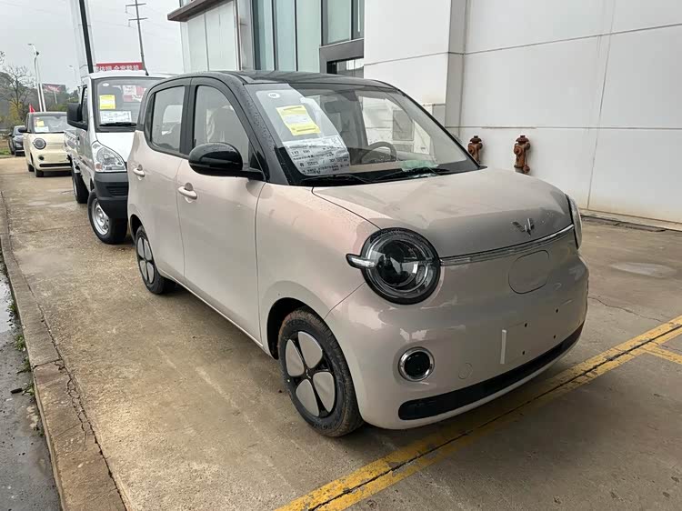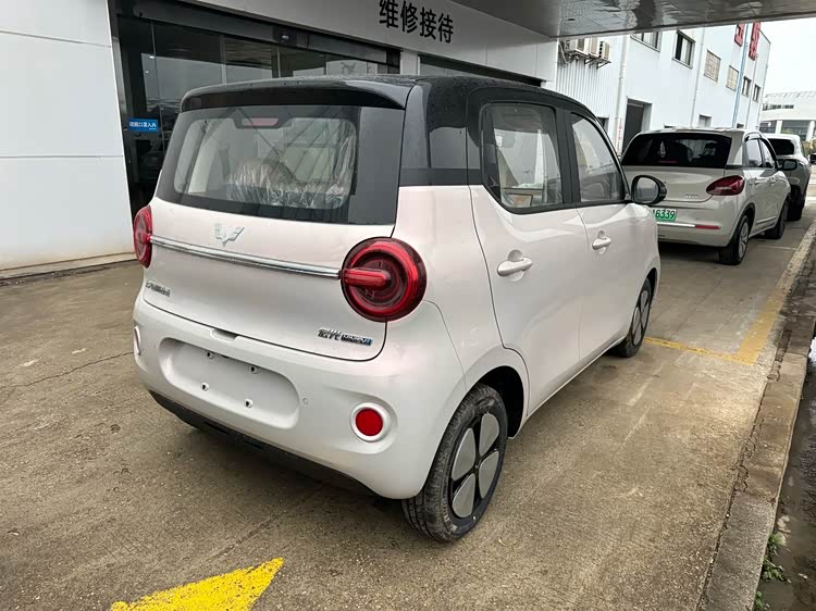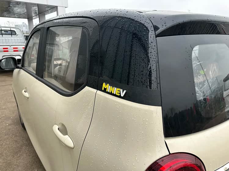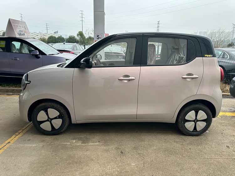 在车身的侧面,我们可以看到全新一代的五菱宏光MINIEV采用的是方正的轮廓,它的边角比较圆润一些,看起来很有柔和感。新车的双拼颜色看起来也非常的运动化,它采用的是黑色车顶,侧面的中间采用了突出且饱满的轮廓,新车还采用四叶草风格的车轮毂。