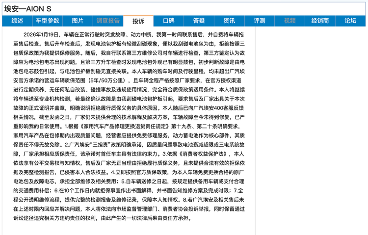 另一个案例发生在一位埃安S车主身上,于2026年1月19日,车主在道路正常行驶过程中时突车发故障、动力中断,车主第一时间联系售后,自费将车辆拖至售后检查。售后把车辆举升后发现电池护板有轻微刮碰现象,便以刮碰电池包为由,拒绝按照“三包质保政策”为车主提供保修服务。