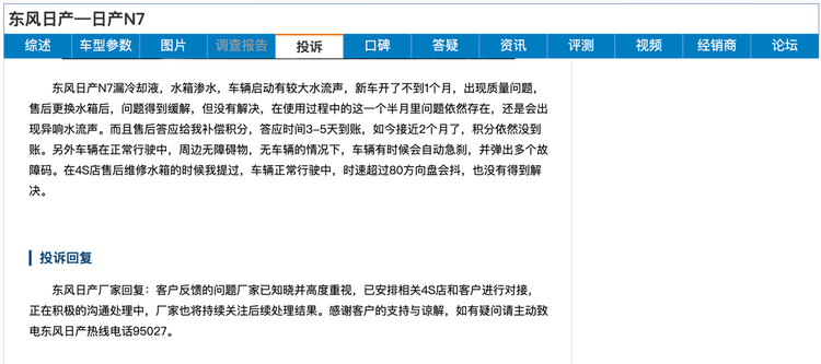 东风日产这边则更令人担忧,有东风日产车主反馈,新车开了不到1个月,出现了漏冷却液,水箱渗水,车辆启动车有较大水流声等质量问题,售后更换了相应配件后,问题得到一定缓解,但车主在使用的一个半月后问题依然存在,还是会出现异响水流声。