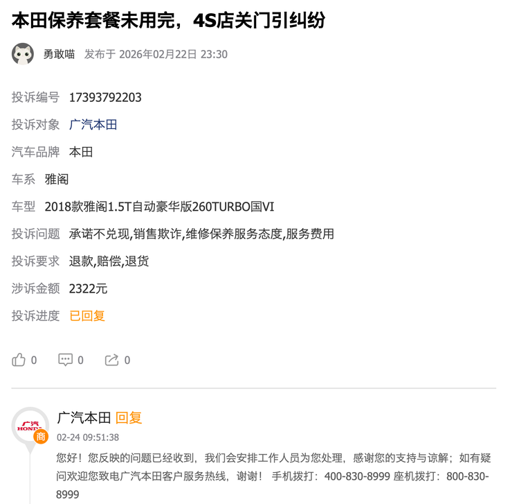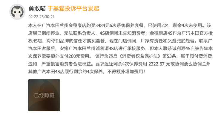 车主的诉求其实很简单,退还剩余4次保养费用2322.67元或协调兰州其他广汽本田4S店履行剩余的4次保养,期间不得额外增加费用。