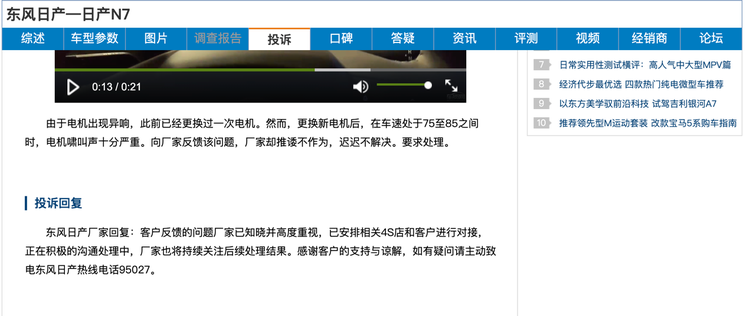 另一位日产N7车主则遇到了电机异响问题,车主在此前已经通过售后更换了一个新的电机,但更换后车子依然在75-85km/h速度区间产生电机啸叫,车主也把情况向厂家进行了反馈,但厂家却推诿不作为,电机啸叫异响仍得不到实质性的解决。