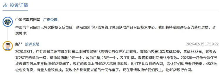 根据相关的汽车投诉平台了解到,兰州的赵先生于2020年在当地东风本田4S店花费3688元购买了终身保养套餐,但今年1月到店保养时发现,原来的4S店换成新的德泰昌,但新的4S店以该套餐是上一家店购买为由,拒绝为其提供保养服务。