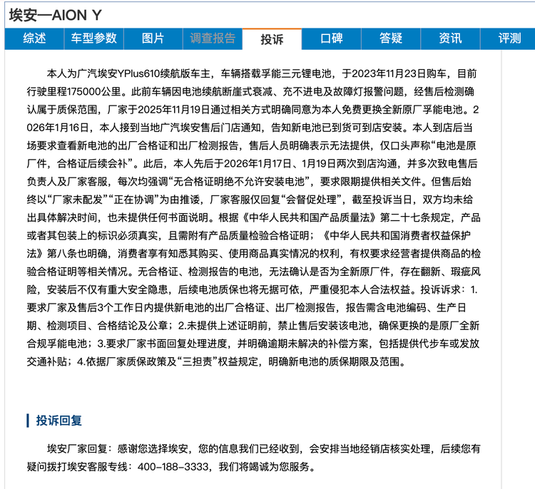 无独有偶,另一个用户案例也十分相似,二者均为埃安Y610续航版车主同样是换电问题,该车主的车辆在行驶了175000km之后,发现电池性能衰退严重并出现充不进电的问题,经售后检测确认属于质保范围,厂家于2025年11月19日通过相关方式明确同意为车主免费更换全新原厂孚能电池。