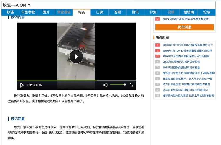 比如广汽埃安部分车型电池问题,有埃安Y车主反馈,车辆子在行驶了8万公里后电池包已经有异常现象,车辆于9万公里时回厂更换了动力电池包,按理说新的电池组更换后,车辆整体续航表现会比以往有衰减的电池包要来得扎实,但现实续航却比以往还要更短,真实续航连300km不到,要知道车主买的还是610km的高配车型。