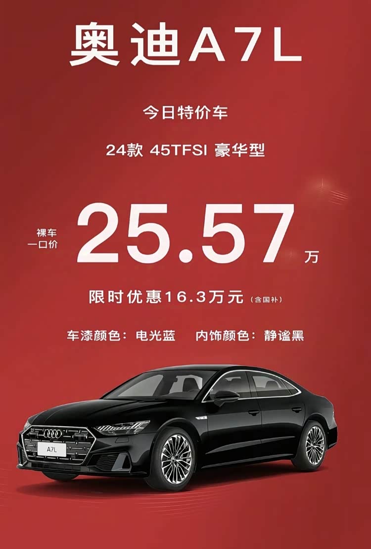 车市进入买方市场后,汽车价格必然暴跌,都说非豪华品牌合资车降价厉害,实际上豪华品牌降价最厉害,可以说跌麻了。比如 奥迪A7L(参数|询价),虽然国产了,但当时指导价依旧高达41.87万,全款超过45万,如果是按揭,加上利息,总费用要小五十万,注意这是入门版哦,现在一口价干到25.57万。这是什么概念?要知道2022年的奥迪A4L,最低配版本的指导价都高达28.98万,全款落地超32万,如今这个价格买一辆奥迪A7L还能有余钱,这就有点尴尬了。