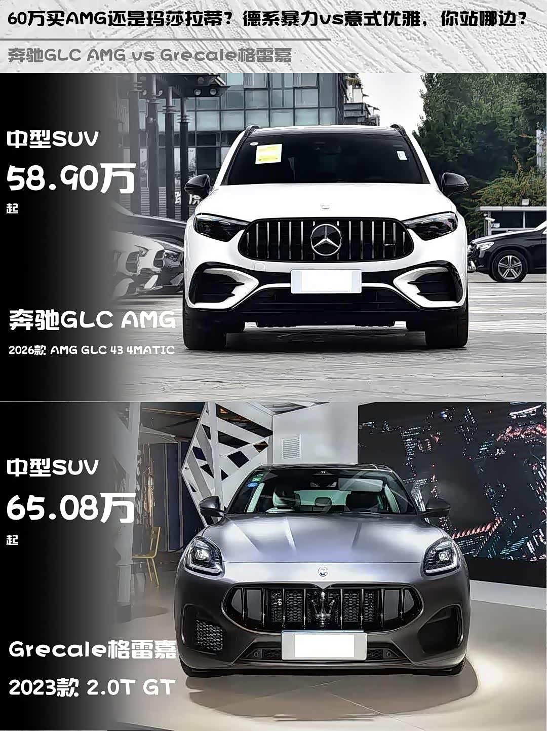 车家号·0浏览·2026-03-05 08:42 · 北京奔驰GLC AMG 2026款 VS Grecale格雷嘉(参数|询价) 2023款:60万级性能SUV怎么选?