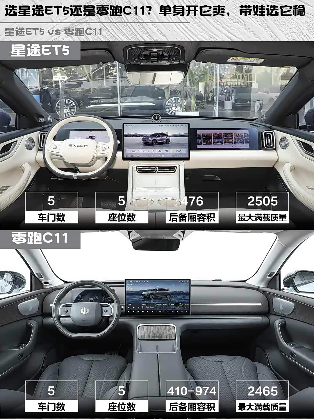 单身或小两口追求驾驶乐趣选星途ET5,激光雷达智驾+终身质保真香;家庭用户看重空间选零跑C11,后排能轻松装下儿童安全座椅+露营装备。对了,星途暮光紫车漆在阳光下会变色,零跑的雾凇米耐脏指数五颗星,颜控自己斟酌~