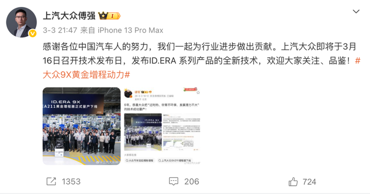 当然了,尽管受到了曾经“轻视”的厂商高管的“轻视”,但是上汽大众负责人傅强还是在社交平台上贴出了EA211增程器下线的图片和“硬哥”的发文截图,并且配文:感谢中国汽车人的努力,我们一起为行业进步做出贡献!