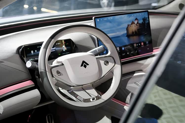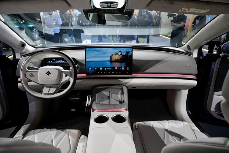 内饰采用环抱式座舱布局,12.3英寸全液晶仪表+27英寸W-HUD抬头显示+15.6英寸悬浮式中控屏组成了前排的显示系统。方向盘采用椭圆形三辐式设计,换挡机构为怀挡,新车还配备了23扬ADiGO SOUND音响。内饰提供三种颜色,赤壁丹霞、多佛白崖和冷湖黑山。