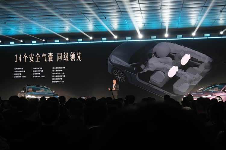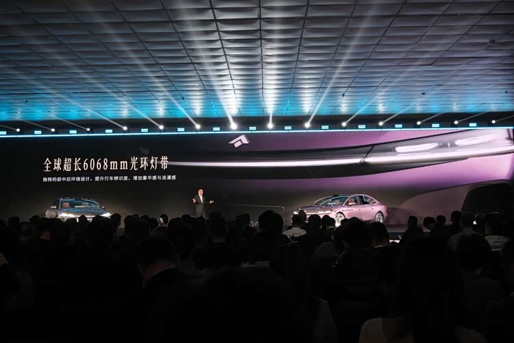 外观方面,新车整体造型很有气场,而且在很多细节上也有创新。首先,新车前脸采用分体式灯组设计,上方的钻石切割日行灯内部为动态翻转效果,可以和智驾小蓝灯进行切换。同时,6068mm的贯穿星环灯带造型也十分夸张,修长的日行灯一直延伸到了翼子板和前车门两侧,小蓝灯点亮后可以起到很好的侧向提醒效果。此外,该车还配备了华为百万像素智慧投影大灯,支持9款灯语设定,可以显示不同迎宾效果。