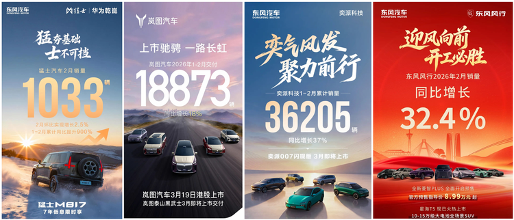 新能源转型成为了东风汽车业绩增长的核心引擎,旗下自主品牌多点开花尽显硬核实力。1-2月,豪华电动越野品牌东风猛士累计销量同比飙升900%,其2月销量达1033辆,环比增长 2.5%,进一步站稳国内豪华智能越野品牌C位。东风岚图品牌高端化步伐稳步向前,1-2月交付量达18873辆,同比增长18%;3月,品牌扛旗之作岚图泰山黑武士即将登场,开启全新“车驾时代”;3月19日,东风岚图更将正式登陆港股,开启央企高端智慧新能源发展新阶段。东风奕派科技1-2月销量36205辆,同比增长37%;3月,东风奕派007闪现版即将上市。东风风行2月销量同比增长32.4%,品牌旗下全新新能源SUV——风行星海T5正式上市,赋能千万中国家庭出行。