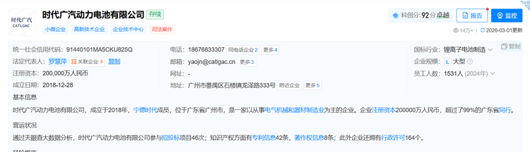 时代广汽动力电池成立于2018年12月28日,注册资本为20亿元,注册地址位于广州市番禺区广汽智联新能源汽车产业园内,是宁德时代与广汽集团在动力电池领域深度合作的核心载体。
