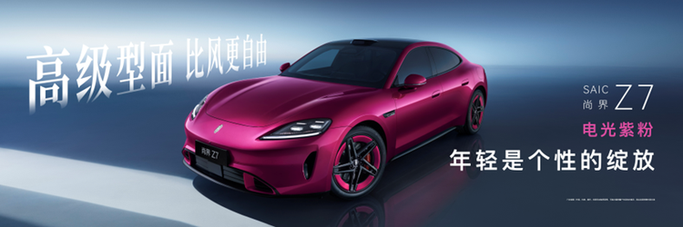 尚界Z7首次亮相带来一款电光紫粉的全新车身配色,全系搭载华为途灵平台。