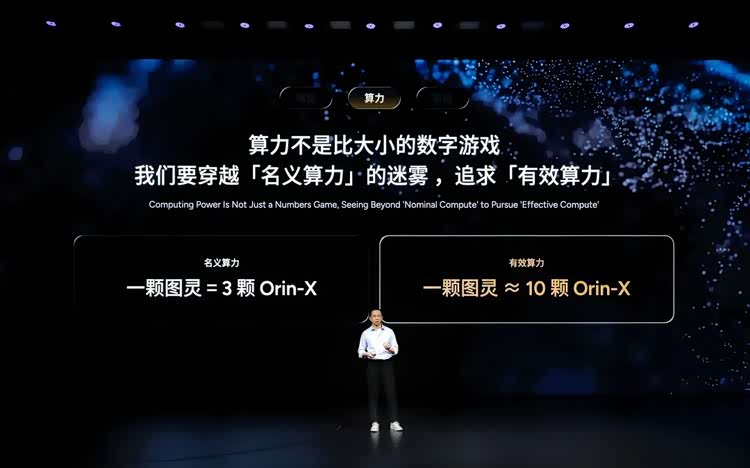之前小鹏提到过,一颗图灵芯片的名义算力相当于三颗Orin-X,经过全场景设计优化之后,现在一颗图灵芯片的有效算力能到达十颗Orin-X的水平。