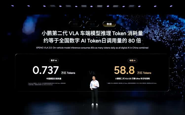 春节期间,全国通用AI数字模型每日消耗量在0.737亿Tokens,小鹏车型全量运行时的日Token消耗量则达到了58.8万亿,是全国通用AI消耗的80倍。