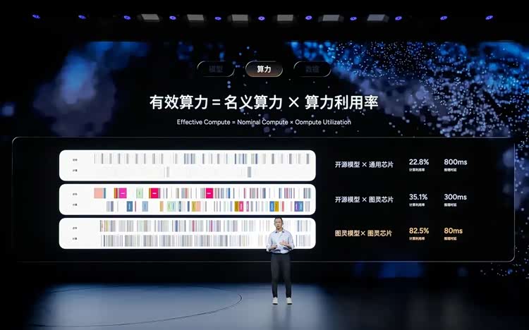 刘先明认为,有效算力等于芯片名义算力乘以算力利用率,后者则取决于算法模型与芯片的适配程度,计算密度越高就意味着芯片利用率越高。这个观点地平线也曾经提到过。