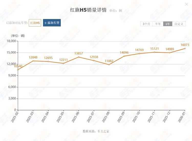 再看红旗H5。作为自主品牌冲击高端的代表,红旗H5凭借全系均衡的配置和巨大的终端优惠,成功成为了许多年轻人“第一台豪华车”的平替。2025年全年销量超过16万辆,到了2026年1月,红旗H5更是以16073辆的成绩冲进B级车销量前四,成为榜单中唯一跻身前列的国产车型。这背后,是越来越多消费者对国产品牌认可度的提升,也是红旗用产品力换来的市场回报。