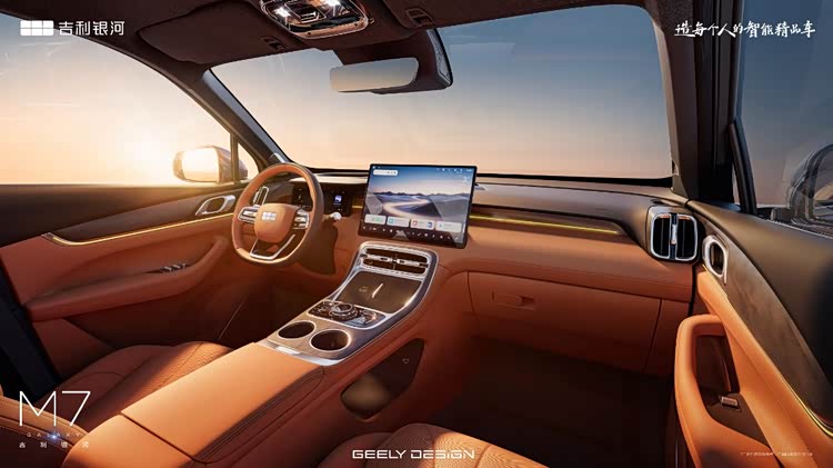 银河M7的车内采用液晶仪表屏+悬浮式中控屏的搭配,内饰加入了木纹饰板、水晶和镀铬元素,提升内饰豪华感。车机方面,搭载Flyme Auto车机系统,无线充电和空调出风口位于车机下方。此外,内饰还提供三种配色可选。
