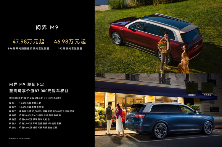 搭载全新一代激光雷达的问界M9,已于2026年3月4日开启预定,建议零售价47.98万元起,即刻下定,至高可享价值87,000元购车权益,权益截止时间为2026年3月31日23:59:59。