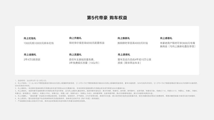 第5代帝豪直接回应了这个问题。3月的购车权益里,除了1000元抵10000元这类常规操作,部分车型限时赠送L2级辅助驾驶系统,1.5TD尊贵型直接把价值6000元的配置权益打包进去。这种“入门即高配”的思路放在燃油车市场里,确实有点搅局的意思。