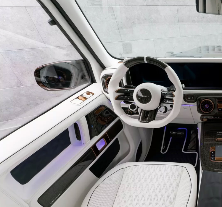 打开车门,内装更是毫不客气。 全车大面积铺上柔软白色真皮,从座椅、门板到方向盘与中控台都全面重塑,搭配黑色对比缝线与滚边点缀,视觉冲击强烈又带点奢华戏剧感。 锻造碳纤维饰板散布其中,仿佛不断提醒你:这不是原厂出品。