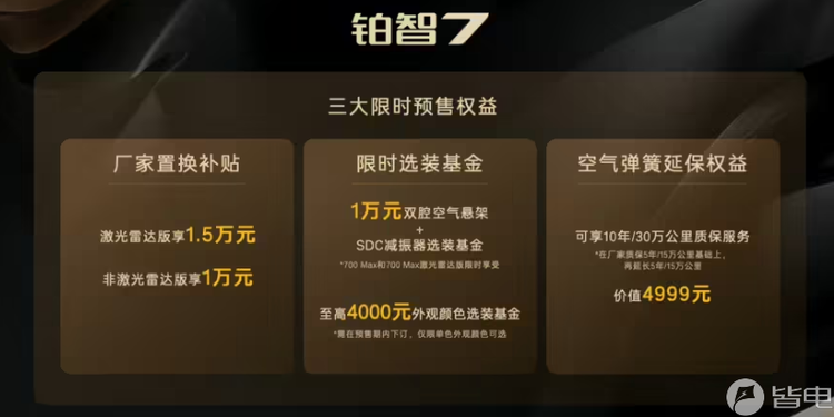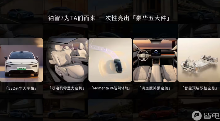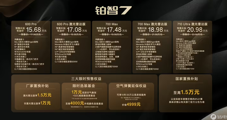 内饰方面,铂智7全系标配鸿蒙座舱5.0系统,配备全液晶仪表盘以及三辐式方向盘,同时搭配大尺寸的HUD抬头显示。配置上将会提供副驾零重力座椅,并且四个座位均提供加热、通风和按摩功能。底盘配备双腔空气弹簧,可实现车身高度与悬架软硬的独立调节,加入“智能预瞄”功能,预先识别路况,主动调整悬架状态。