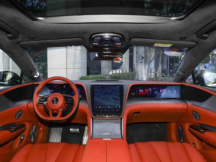 进入车内,内饰采用“星环座舱”设计理念,沿袭中国传统建筑对称之美,以“移动会客厅”为核心,科技配置方面,搭载23.6英寸全液晶仪表+12.8英寸OLED曲面中控屏+23.6英寸副驾屏幕的多屏组合,配合AR-HUD抬头显示,形成多维度交互中心。车机搭载4纳米座舱芯片,操作流畅无卡顿,同时配备中轴旋转升降“丹拿星旋”高音单元,启动时旋转上升,仪式感拉满。空间表现方面,五座版采用常规布局,四座版为分体式设计,后排空间宽裕。前排座椅支持22向调节,配备通风、加热、按摩功能;后排座椅支持18向调节,四座版额外配备腿托与双娱乐屏。