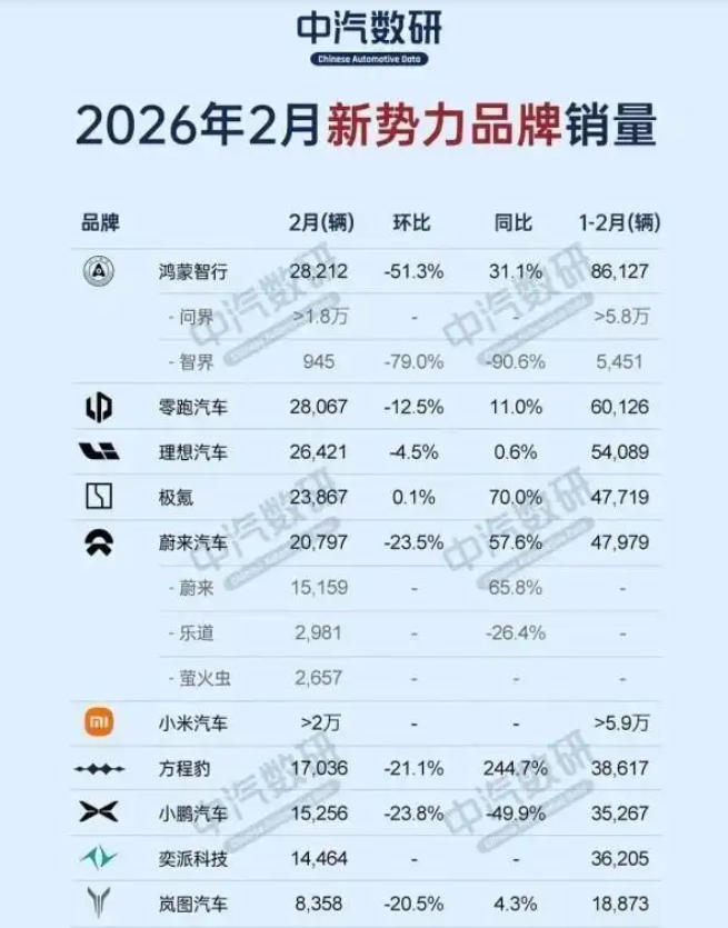2026年2月,国内汽车市场受“史上最长春节假期”影响,在有效销售日和终端客流上均有下滑,叠加节前清库存、消费者持币观望等因素,新势力品牌整体呈现“环比普降、分化加剧”的态势。近期随着各大新势力品牌的销量数据出炉,我们也能一窥不同品牌间的差异化销量答卷,接下来我们就来看看前十名品牌的表现吧。