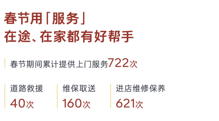 服务层面,春节期间乐道累计提供上门服务722次,其中道路救援40次、维保取送160次、进店维修保养621次,及时的响应的完善的服务,为家庭出行解除了后顾之忧。