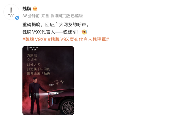 近日,魏牌V9X宣布代言人为长城汽车董事长魏建军,有意思的是,这件事情是广大网友促成的,面对“魏建军代言魏牌V9X”的呼声,魏建军予以最高规格回应,选择亲自下场代言。