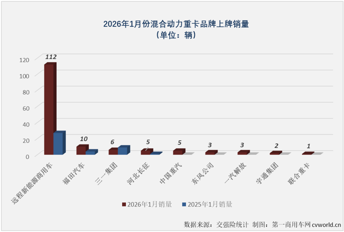 车家号·0浏览·2026-03-05 21:08 · 北京2026年1月份,混合动力重卡实销147辆,同比增长259%,截止到2026年1月份,混合动力重卡这一轮的连增势头已达到“16连增”。