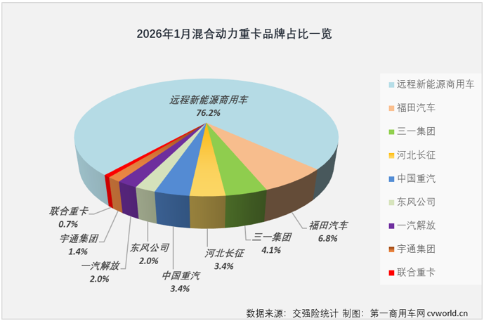 从市场份额来看,排名首位的远程独食1月份混合动力重卡市场76.2%的份额;排名2、3位的福田和三一1月份市场份额分别为6.8%和4.1%;并列第4位的长征和重汽月度份额为3.4%;并列第6位的东风和解放月度份额为2.0%;宇通和联合重卡月度份额分别为1.4%和0.7%。