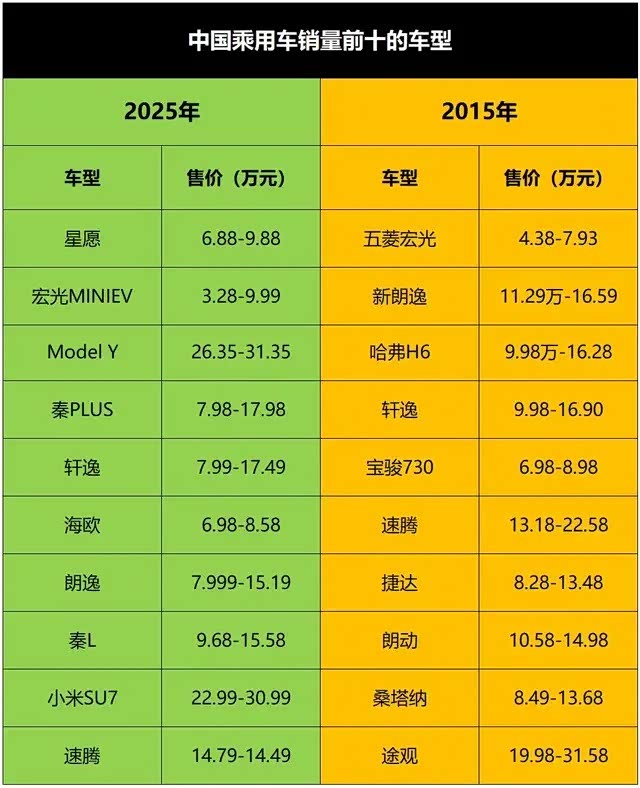 反观中国汽车市场,从2015到2025这十年间,中国车市从燃油车主导到新能源崛起,从合资品牌霸榜到中国品牌突围,车价不仅没有大幅上涨,反而在技术升级、配置提升的背景下持续下探,消费者购车成本显著降低,购车选择更加多元化。