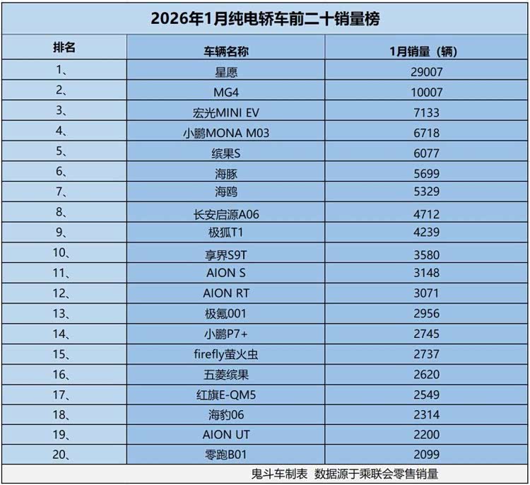 小鹏P7+排名第十四位,1月零售销量达到2745辆;firefly萤火虫排名第十五位,1月零售销量达到2737两,这两款纯电轿车都属于“个性派”,1月份的销量表现不温不火。此外,进入前二十销量榜单的车型还有五菱缤果、红旗E-QM5、海豹06、AION UT以及零跑B01,这些纯电轿车1月份零售销量都在2000辆以上。
