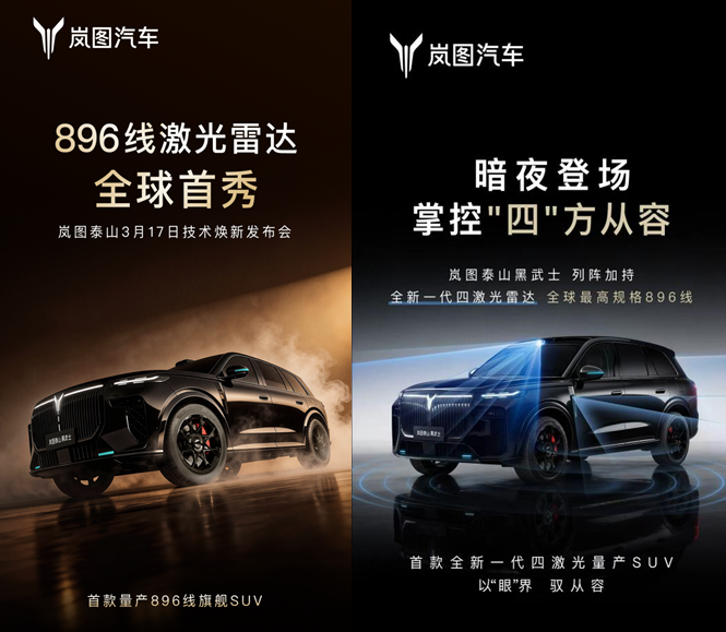如果说昨天华为公布新一代激光雷达还只是“预告”,今天岚图就直接把量产车拍在了桌子上。3月5日,岚图汽车正式官宣:旗舰大六座SUV--泰山Ultra版与黑武士版将于3月17日上市并同步交付。这台车的核心卖点简单粗暴,全球首搭量产896线四激光雷达,智驾硬件直接拉到当前天花板。