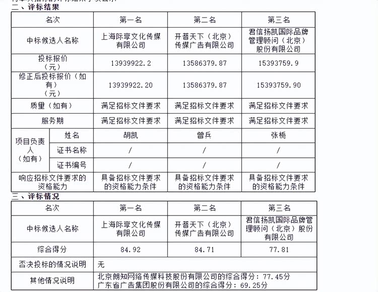 或许是对于两大实力企业的信赖和巨大金额的吸引,业内不少知名公关公司都来参与投标,包括上海际享文化传媒有限公司、开普天下(北京)传媒广告有限公司、君信扬凯国际品牌管理顾问(北京)股份有限公司、北京朗知网络传媒科技股份有限公司、广东省广告集团股份有限公司等。