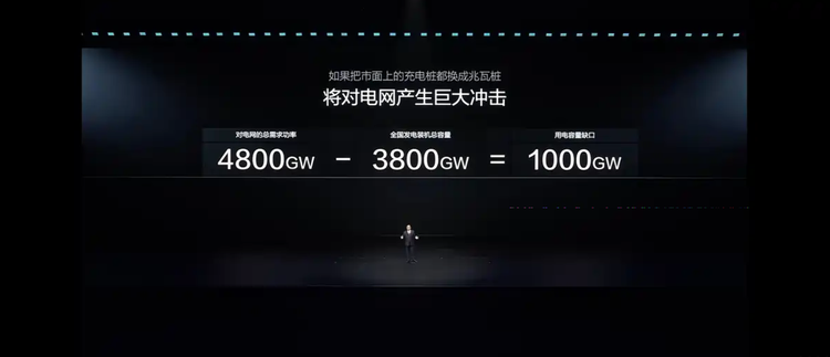 在发布会上,比亚迪还对充电网络与电网之间的关系进行了说明。目前国内充电桩数量已经超过480万个,如果全部更换为兆瓦级快充设备,将对电网形成巨大负荷。按照单桩1000kW计算,总需求可能达到4800GW,而当前国内发电容量约为3800GW。