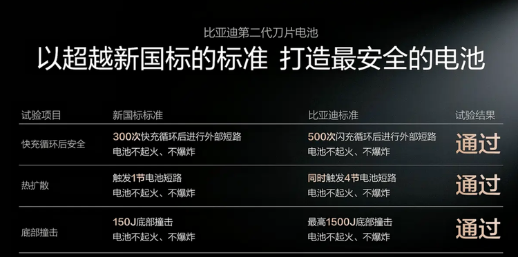 电池安全是新能源汽车技术体系的重要部分,因此发布会上同时公布了一系列测试条件。按照官方介绍,第二代刀片电池在完成500次闪充循环后进行针刺测试,在持续充电状态下对电芯进行穿刺实验。测试完成后电池包静置约2小时,实验过程中未出现烟雾、起火或爆炸情况。