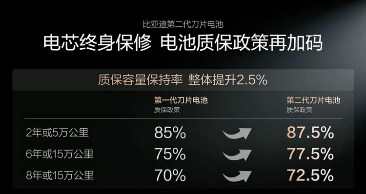 官方资料显示,该电池在材料、电极、电芯结构以及电池系统四个层级进行了重新设计。通过结构优化,电池在循环寿命、安全性以及低温充放电能力方面均有所提升。对于北方地区冬季用车环境而言,低温充电效率的变化会直接影响车辆使用体验,因此电池在低温工况下的充放电能力成为重要指标之一。在质保政策方面,新电池维持电芯终身质保,同时增加容量保障标准。当车辆使用6年或15万公里后,如果电池容量低于77.5%,用户可以获得免费更换服务。相比此前标准,电池容量保持率提高约2.5%。