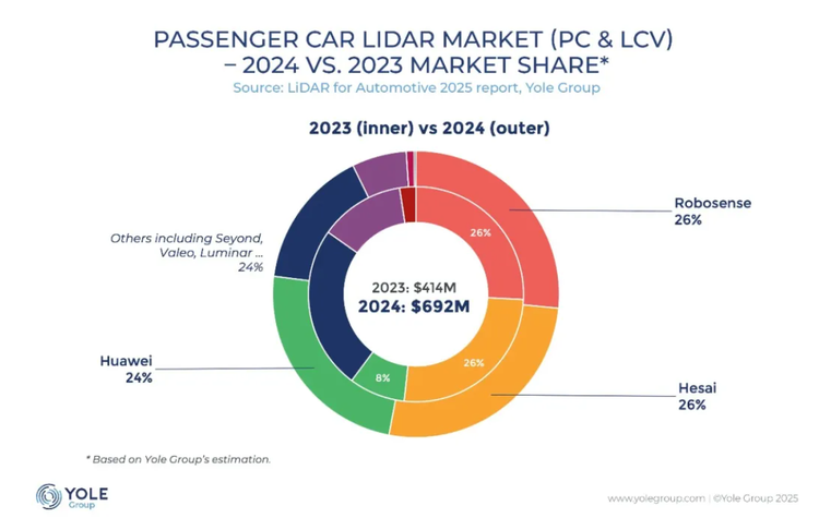 24、25年,全球市场的激光雷达出货量,前五分别为: