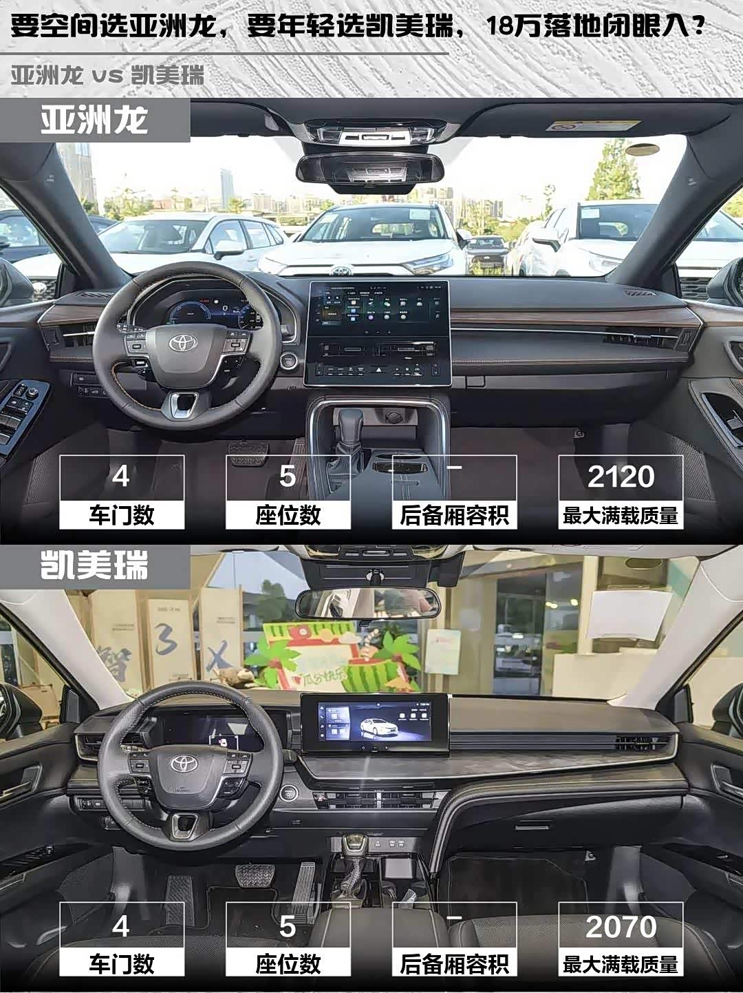 亚洲龙前排双层隔音玻璃+后排座椅加热(凯美瑞需顶配才有),冬天幸福感爆棚。但凯美瑞运动版红黑内饰+64色氛围灯更年轻,翻毛皮座椅包裹性也更好。要吐槽的是两车发动机介入时噪音都不小,丰田祖传问题...