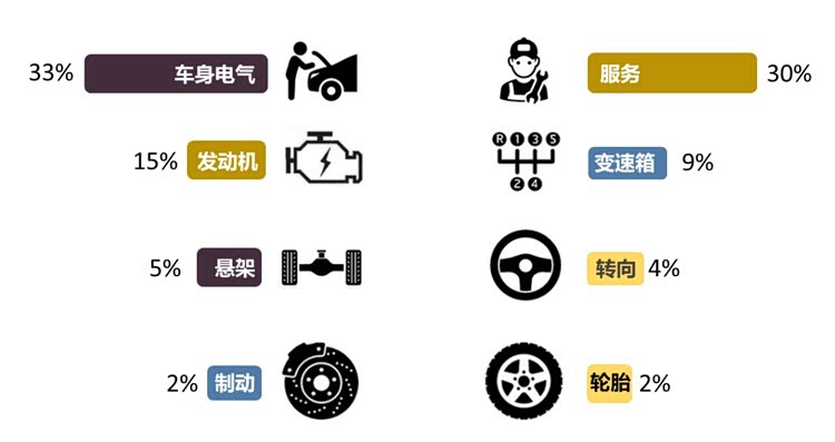 六、从投诉问题分布来看,车身电气类问题投诉率排名第一,投诉占比达到了33%。迈锐宝XL高位刹车灯断裂、昂克赛拉空调膨胀阀垫片生锈、威兰达卡片钥匙失灵、极狐T1高压线束裸露都是槽点。服务类投诉紧随其后,占比达到了30%。海豹未按承诺推送哨兵模式功能、荣威D7未升级、极狐T1购置税补贴变动成了三大典型投诉对象。另外,2月份发动机问题投诉占比达到了15%,飞度发动机异响依然是主要问题。