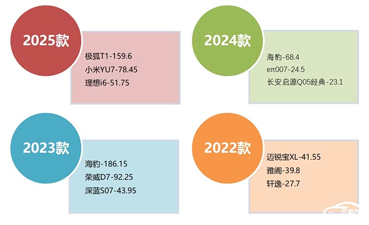 五、从车型年款来看,三年内的新车仍然是主要投诉源,投诉指数占比达到了56%。另外,六年以上的老车投诉占比接近25%。具体来看,2025款车型投诉占比第一,极狐T1减配电机护板、小米YU7和理想i6不按时交付是被投诉最多的问题。2023款紧随其后,海豹和 荣威D7(参数|询价)车机不升级成了主要吐槽对象。其他年款未见明显典型投诉出现。