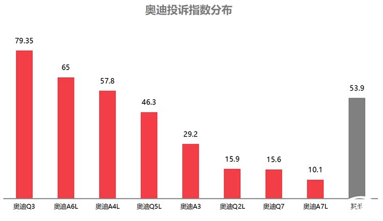 由于多个投诉热门品牌投诉都大幅下降,奥迪罕见地冲到了投诉榜第三位。值得一提的是,奥迪的整体投诉指数并不高,也未出现新的集中投诉。奥迪Q3变速箱电脑板故障成了奥迪被投诉最多的问题。