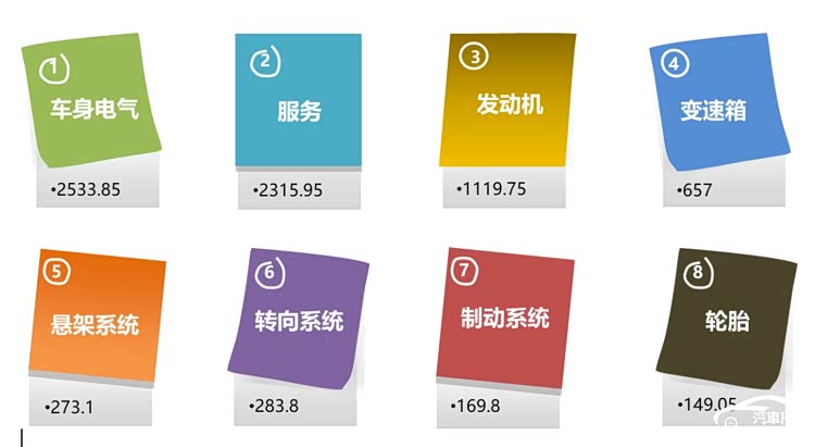 投诉指数:汽车门网全新构建汽车投诉指数计算模型(简称:QCMS),将车型质量投诉分为八大类,根据发动机、变速箱、车身及电气、制动系统、转向系统、悬挂系统、轮胎、服务等问题影响严重性分别赋权,并对集中性事件额外加权,最终形成有效投诉指数,指数越大越严重。
