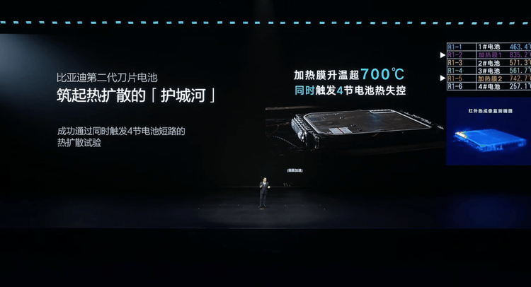 今年动力电池新国标需要做1节电池热失控的测试,比亚迪对第二代刀片电池直接做了4节电池的热失控测试,仍然不会起火,不会爆炸。