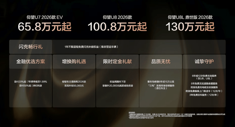 仰望U7的CLTC续航里程超过了1000公里,动力方面拥有超过1300匹马力,兼具续航和动力,这款车的最终售价为65.8万元起。
