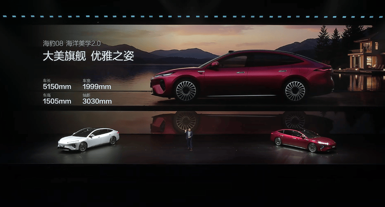 海豹08也迎来了首秀。其车身长宽高分别为5150/1999/1505mm,轴距为3030mm。车辆将会搭载闪充、后轮转向、辅助驾驶、云辇A等技术,将会在第二季度上市。